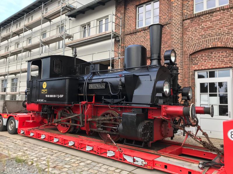 Bei der Dampflok "Pritzwalk" handelt es sich um eine Rangierlokomotive aus dem Hause Henschel, Kassel, die im Jahr 1912 unter der Fabriknummer 10802 gebaut wurde. Die Firma Henschel hatte seinerzeit einige Standardlokomotivtypen im Angebot, die sie nach den Einsatzorten der ersten Modelle des jeweiligen Typs benannte. Bei der "Pritzwalk" handelt es sich um eine Lok des Modells "Riebeck". Die Riebeckschen Montanwerke waren bis 1922 in der mitteldeutschen Braunkohleindustrie tätig und bestellten eben die ersten Schwestern der "Pritzwalk" als Rangierloks für ihre Werksanlagen. Die Lok "Pritzwalk" wurde an die Frankfurter Gasgesellschaft geliefert, die sie als Rangierlok in einem Werk zur Gewinnung von Stadtgas in Frankfurt einsetzte. Das Gas wurde seinerzeit aus Steinkohle gewonnen, die per Schiene angeliefert wurde. Nach der Entgasung blieb unter anderem Koks übrig, der per Schiene auch wieder abgefahren wurde. Für die Bereitstellung der entsprechenden Güterwagen wurde die "Pritzwalk" benötigt, die seinerzeit allerdings diesen Namen noch nicht trug. 1971 wurde die Lok abgestellt und an einen Autokran-Dienst in der Nähe von Frankfurt/M. verkauft, der sie als Denkmal aufstellen wollte. Der Plan wurde jedoch 1979 verworfen und die Lok wurde nach Wuppertal-Barmen verkauft, wo sie fortan als Blickfang vor einem Modellbahngeschäft stand. 1999 erwarb die Prignitzer Eisenbahn die Lok und ließ sie später aufarbeiten. Im Jahre 2004 erfolgten die ersten Probefahrten. Allerdings kam sie nachher nur in Ausnahmefällen zum Einsatz. Anlässlich des 25-jährigen Jubiläums des Vereins Dampflokfreunde Salzwedel e.V., des Trägervereins des Historischen Lokschuppens Wittenberge, wurde die Lok im Oktober 2019 nach Wittenberge transportiert und seit langer Zeit einmal wieder der Öffentlichkeit im Betrieb vorgeführt. |