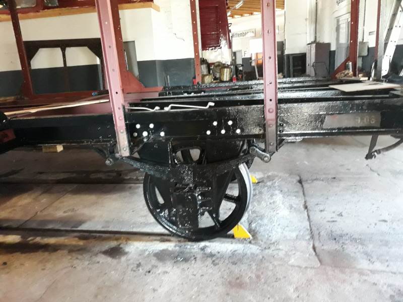 Da das Holz inzwischen aber marode war, wurde alles entfernt. Da der Wagen nun erheblich erleichtert ist, konnten wir das Gerippe ausachsen, die Achsführungen und die Achsen selbst entrosten, neu lackieren und die erste Achse schon wieder einbauen.