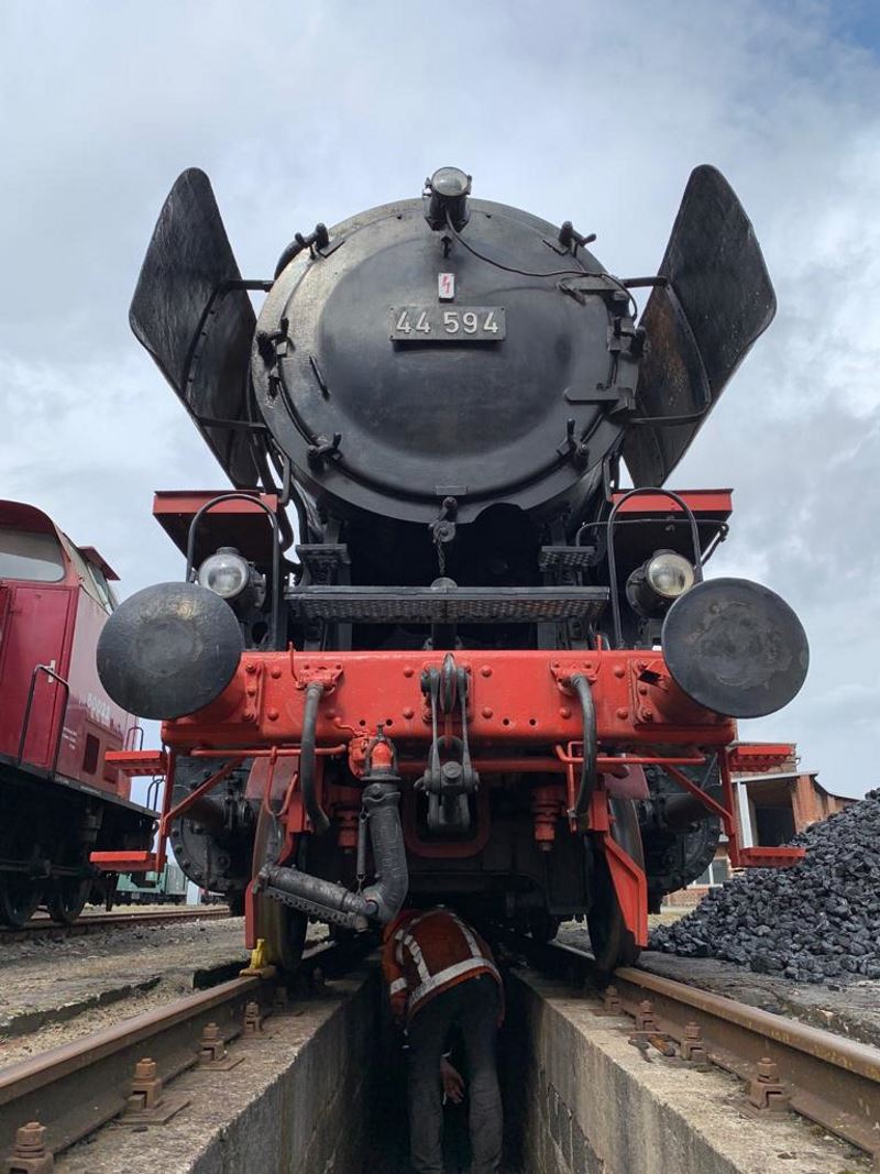 Der heutige Tag wurde der Fahrzeugpflege gewidmet. Gerade die Exponate, die derzeit draußen stehen müssen, brauchen regelmäßige Pflege. So wurden heute die Achslager unserer Dampflok 44 und der Dieselloks V60 und V22 abgeölt. Da die Exponate ziemlich schwer sind, haben wir die Diesellok 60022 in Betrieb genommen, mit der das Rangieren problemlos durchgeführt werden konnte. Bei der Diesellok handelt es sich um eine Maschine aus dem Hause MaK in Kiel mit 600 PS. Interessant an der Lok ist, dass sie nicht über einen elektrischen Starter zum Starten des Motors verfügt. Vielmehr wird Druckluft in den Motor eingespeist, so dass er die ersten Umdrehungen pneumatisch absolviert. Dabei wird Diesel in die Zylinder eingespritzt und der Motor nimmt Zündung auf. Wie das funktioniert, zeigt der folgende Film: