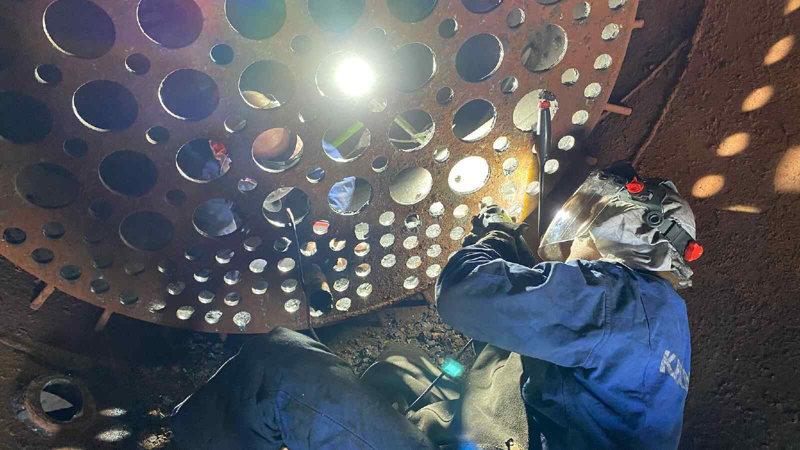 Unsere eigene Dampflok 50 3570 befindet sich gerade noch „in Behandlung“. Ihr wurden ja – wir berichteten schon darüber – alle Rohre aus dem Kessel gezogen, damit sie durch neue ersetzt werden können. Inzwischen hat die Kesselinstandsetzung weitere Fortschritte gemacht. Hier wurden die Rohrwände geschliffen. Das sind die metallenen Wände im Kessel, zwischen denen die Rohre verlaufen. Die Öffnungen, welche die Rohre aufnehmen, müssen tatsächlich kreisrund sein, damit die neuen Rohre tatsächlich druckdicht eingebaut werden können.