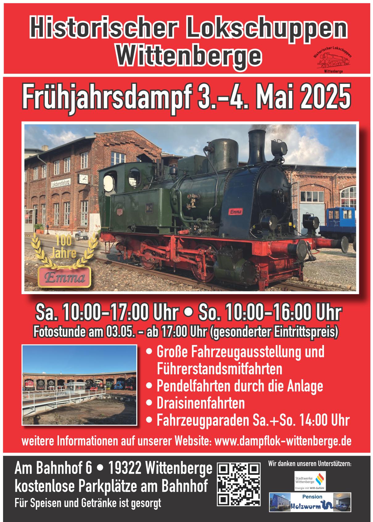 Trotz der Trauer freuen wir uns natürlich auf die Veranstaltung. Sie gibt Ihnen und uns wieder die Möglichkeit, uns jede Menge Dampf um die Nase wehen zu lassen. Nicht nur wird unsere nun 100-jährige Dampflok „Emma“ in Betrieb zu erleben sein. Wir bemühen uns auch um eine betriebsfähige Dampflokomotive der Baureihe 86 der PRESS-Gruppe, die Sie möglicherweise schon einmal bei Ihrem letzten Sommerurlaub auf Rügen oder Usedom gesehen haben. Die Dampfloks und einige Dieselloks stehen bei der Veranstaltung nicht nur zum Ansehen bereit. Auch bieten wir Führerstandsmitfahrten auf ihnen an. Ein tolles Erlebnis!