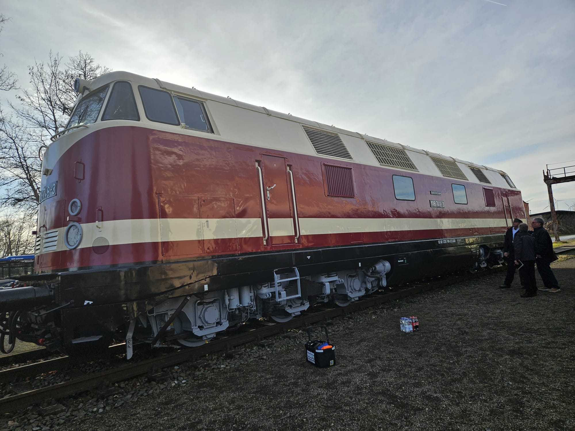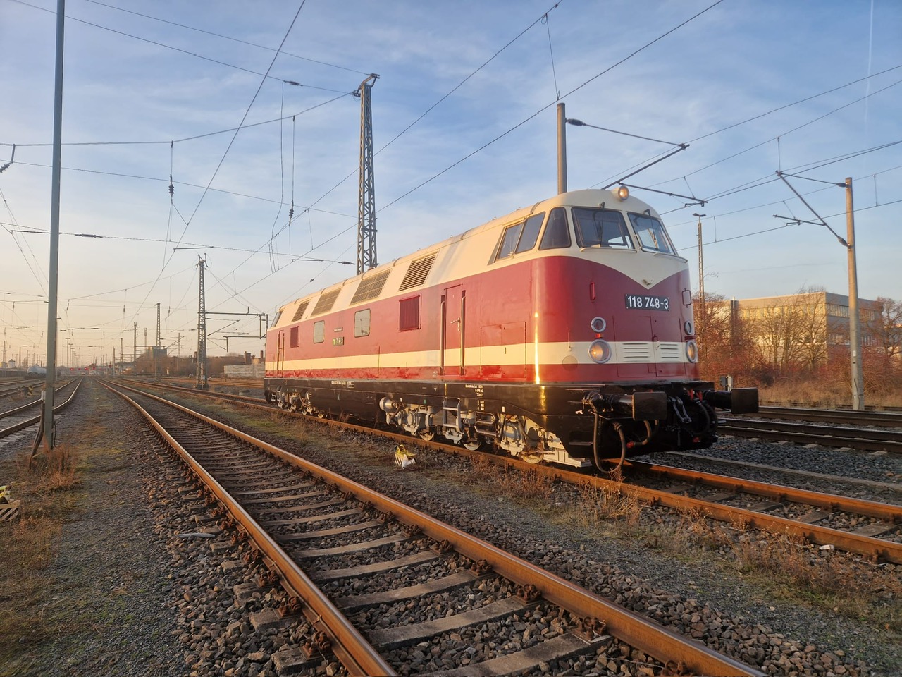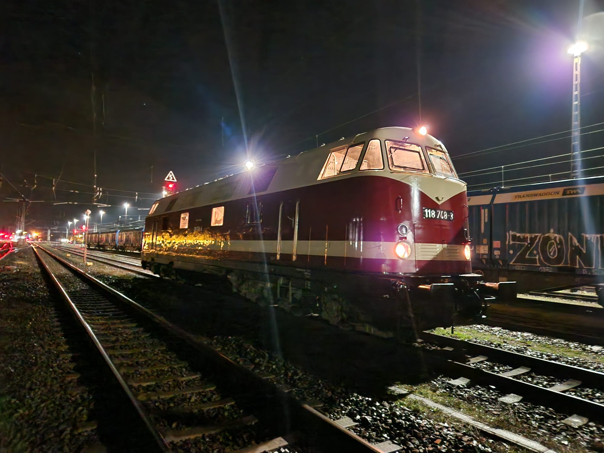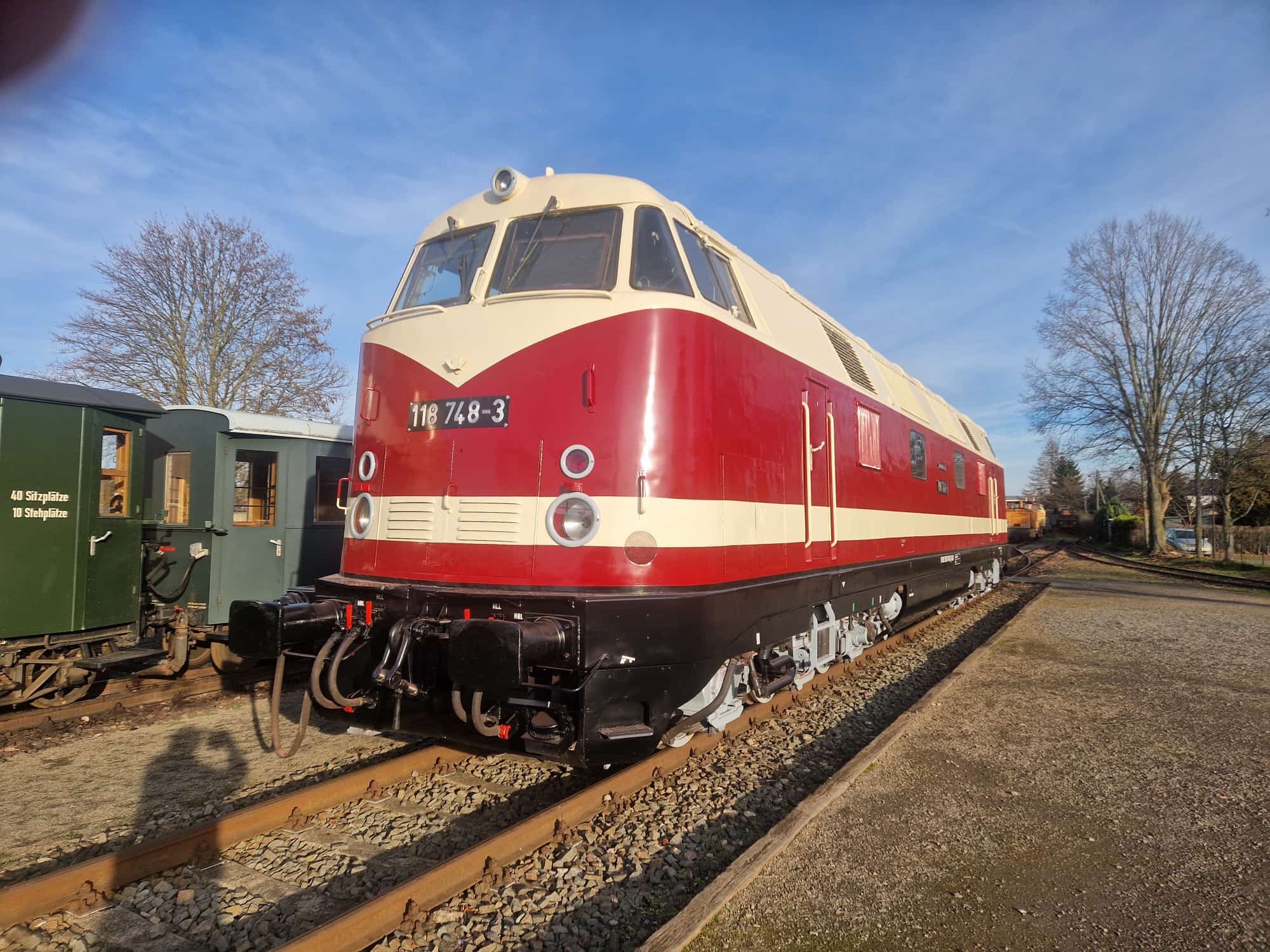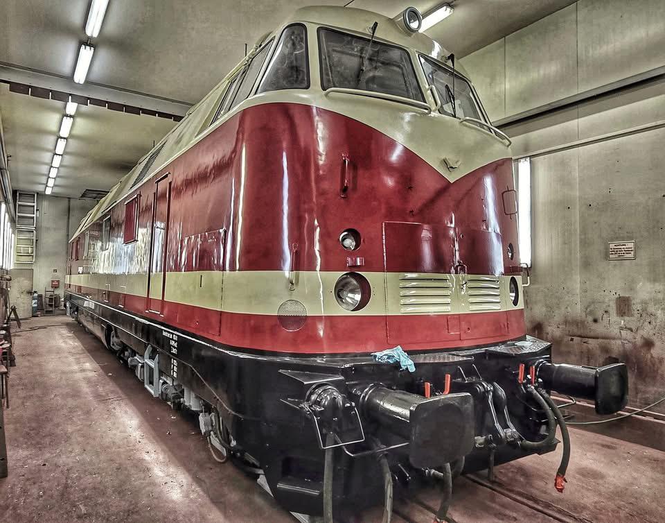 schon wieder ist ein Jahr vergangen und wir steuern auf Weihnachten und den Jahreswechsel zu. Natürlich denkt man dabei auch an Geschenke. Das tun wir auch. So freuen wir uns besonders über unser größtes Weihnachtsgeschenk dieses Jahr. Unsere Diesellok 118 748 ist nun wieder betriebsfähig. Ein paar Worte zu der Lok: Sie wurde 1968 bei beim VEB Lokomotivbau Karl Marx in Potsdam-Babelsberg gebaut, verfügt über zwei Dieselmotoren mit je 1.200 PS und darf maximal 120 km/h schnell fahren. Damit ist sie eine Universallok, die sowohl im Personen- als auch im Güterverkehr eingesetzt wurde. Nach ihrer Abstellung durch die Deutsche Bahn AG im Jahr 1999 wurde sie an die Mitteldeutsche Eisenbahn verkauft, die sie in 2020 an die Firma PRESS weitergab. Seitdem bereichert sie unsere Fahrzeugsammlung, bisher allerdings nur als funktionsfähiges Ausstellungsobjekt ohne Streckenzulassung. Im Jahr 2023 erwarb ein Mitglied unseres Vereins die Lok.