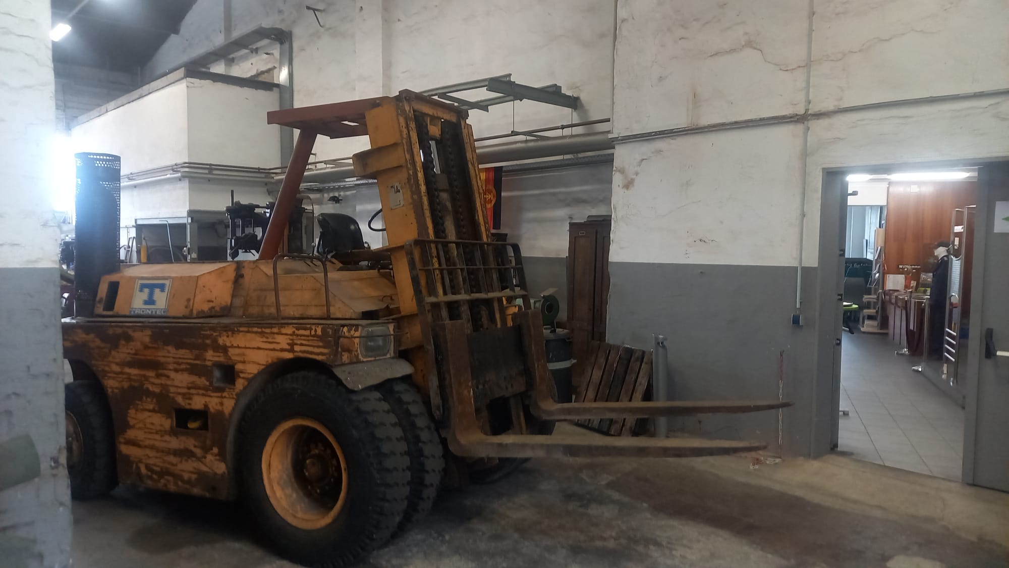 So ein Motor ist übrigens etliche Tonnen schwer und nicht so einfach zu bewegen, wenn man nicht über das notwendige Equipment verfügt. Zum Glück steht uns dafür nun ein großer Gabelstapler aus DDR-Produktion zur Verfügung, der früher im nahegelegenen Nähmaschinenwerk eingesetzt wurde. Für die Technikbegeisterten: Es handelt sich um einen Takraf DFG6302/HG aus dem Jahr 1977. Er wurde vom VEB Verlade- und Transportanlagen Leipzig "Paul Fröhlich" gebaut und wird von einem Dieselmotor angetrieben, wie man ihn auch aus DDR-LKWs der Bauart W50 kennt.