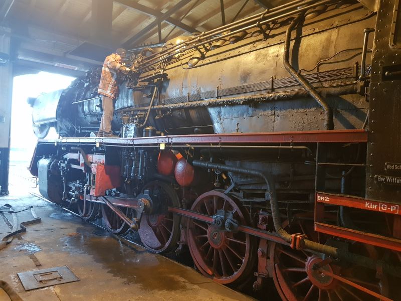 Zu den Konservierungsarbeiten an den Dampflokomotiven gehört, das Wasser aus Kessel, Tender und Nebenantrieben abzulassen. Damit soll verhindert werden, dass sich bei Frost Eis bildet und Bauteile durch den Eisdruck platzen. Auf dem folgenden Bild befindet sich gerade 50 3570 in Behandlung.
