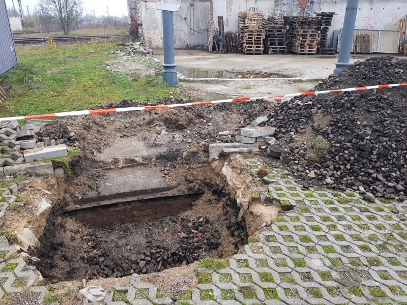 Da mittelfristig auch wieder eine Drehscheibe am Lokschuppen I aufgebaut werden soll, gab es in der letzten Woche schon Probegrabungen, um die noch vorhandene, aber derzeit zugeschüttete Drehscheibengrube, genauer gesagt deren Einfassung, aufmessen zu können.