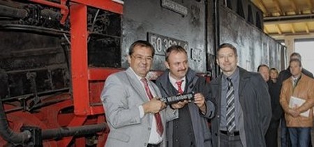 Ein besonderer Moment: Minister Vogelsänger, Dirk Endisch und Bürgermeister Dr. Hermann (v. l.) mit dem neuen Heimatschild für die einstmals in Wittenberge "stationierte" Dampflok.