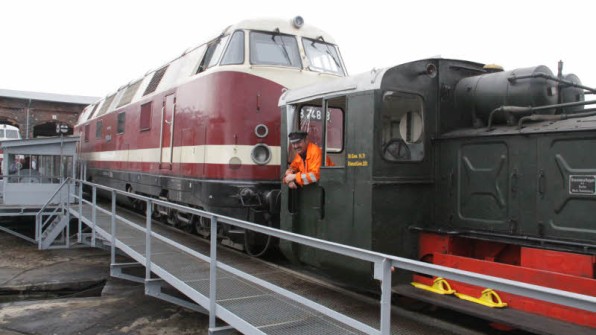 Die kleine Diesellok zieht das neue Museumsstück – die „Dicke Babelsbergerin“ auf die Drehscheibe, im Führerhaus Dirk Endisch. |
